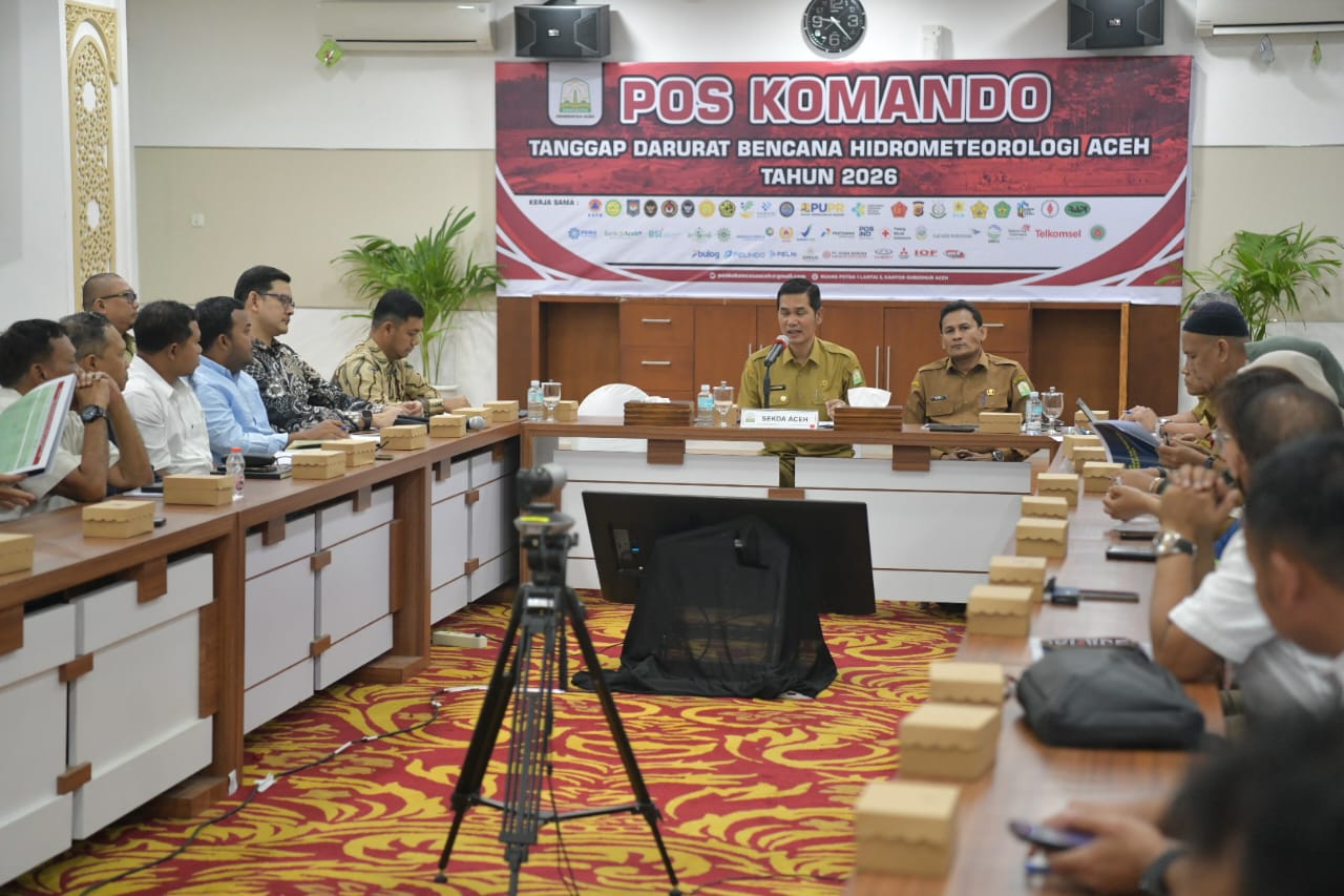 Banda Aceh — Sekretaris Daerah (Sekda) Aceh menggelar rapat bersama puluhan badan usaha untuk memperkuat dukungan terhadap tanggap darurat serta rehabilitasi dan rekonstruksi bencana hidrometeorologi di Aceh, Senin (12/1). Rapat berlangsung di Posko Tanggap Darurat Pemerintah Aceh di Kantor Gubernur Aceh dan diikuti asisten Sekda serta sejumlah kepala SKPA terkait.